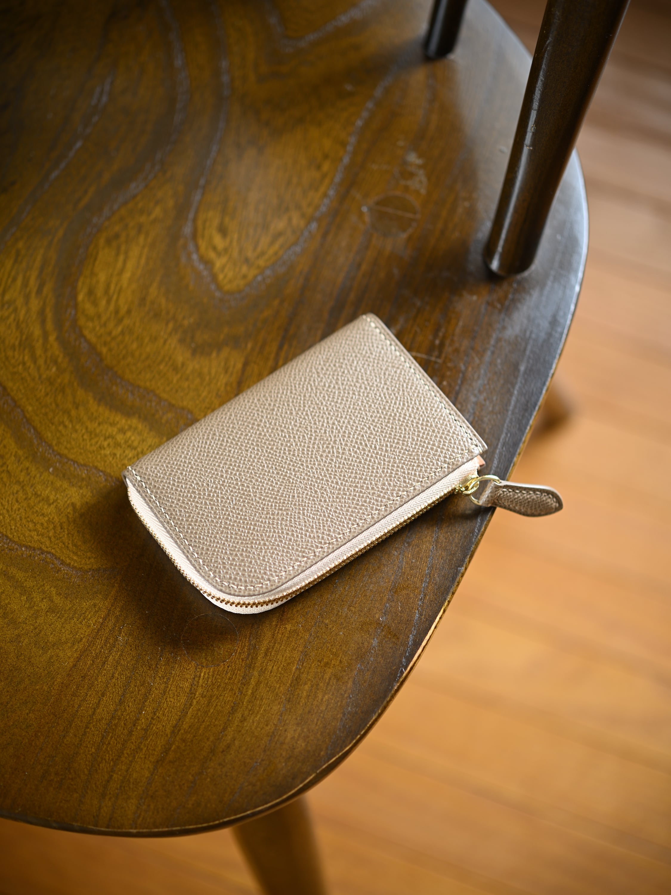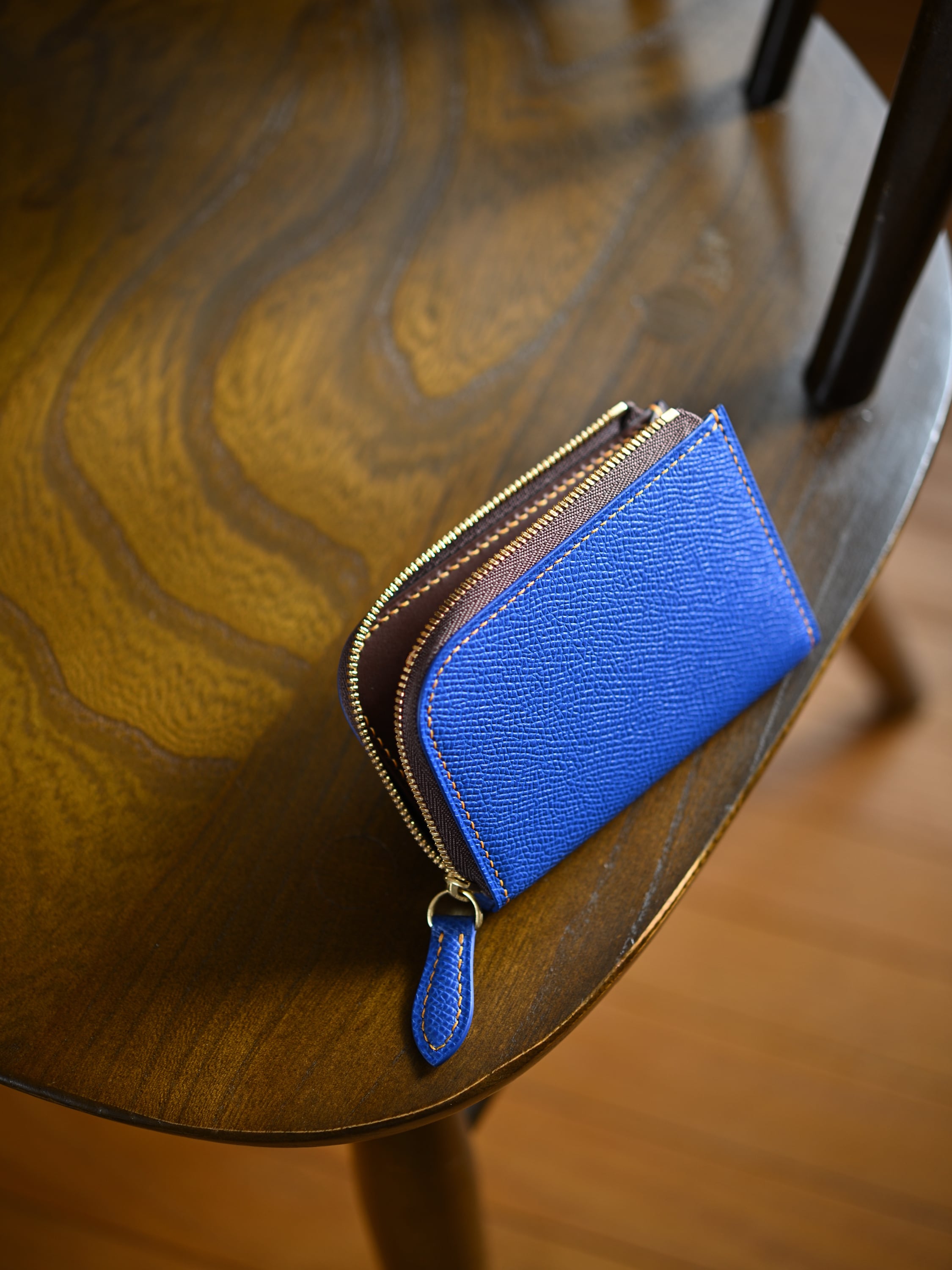 コンパクトさを活かすために、あえてカードポケットなどの細かなパーツを排し、コインポケットを片側に寄せたアシンメトリー構造を採用したオリジナルデザインです。