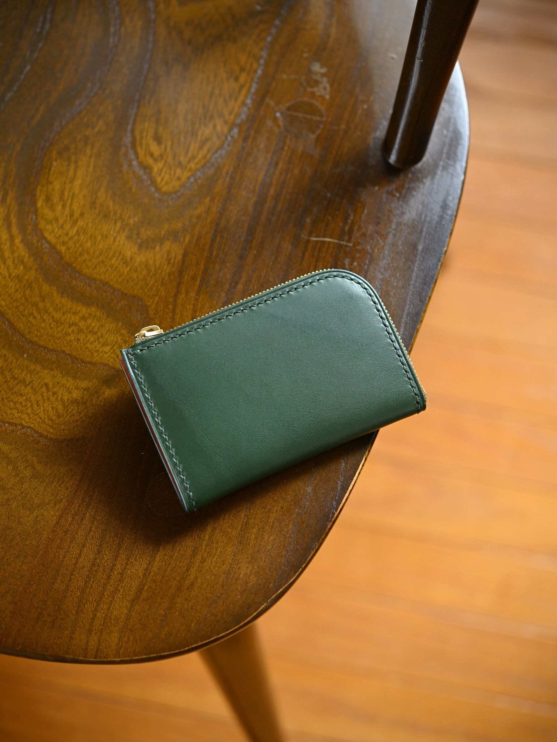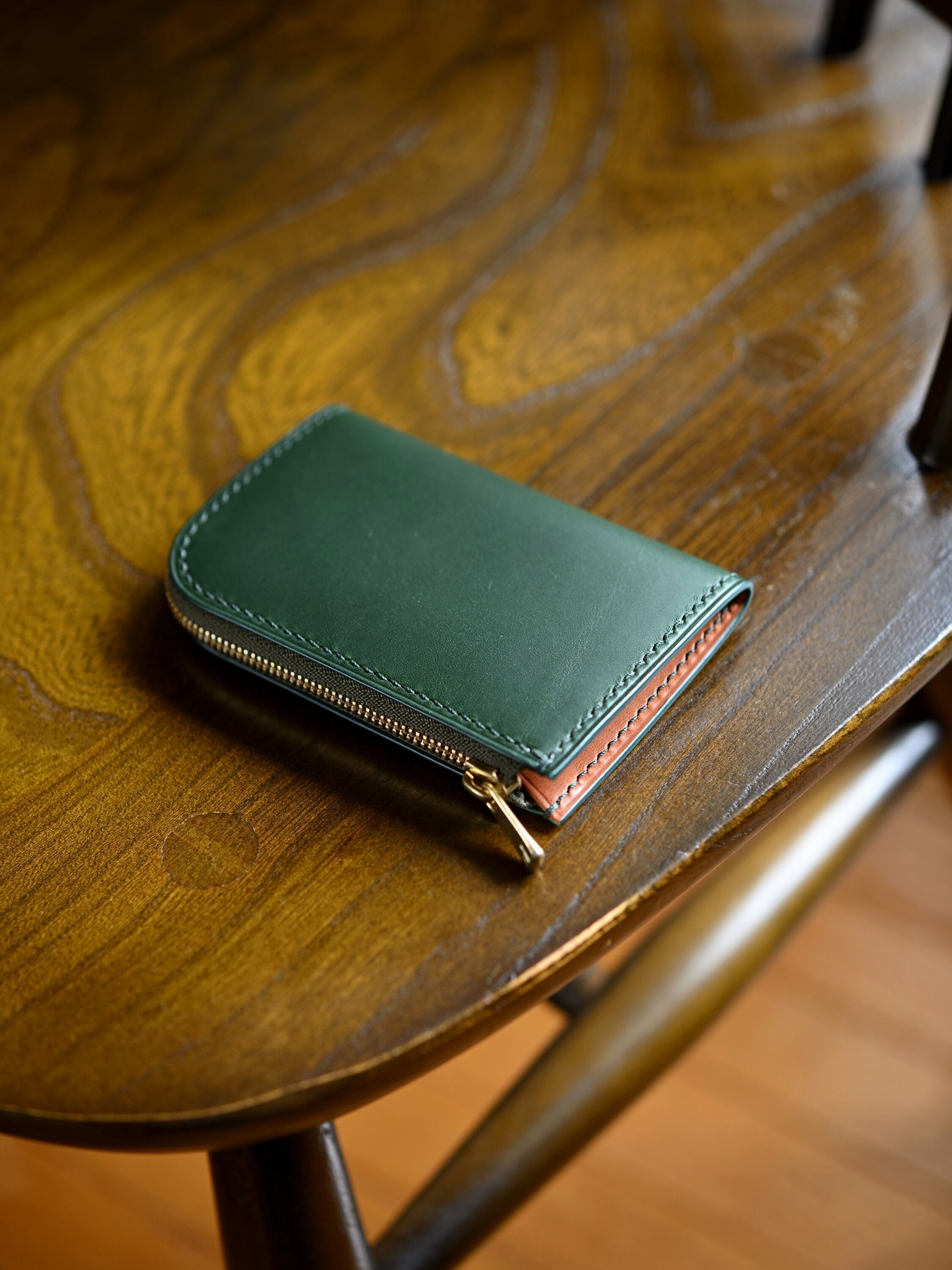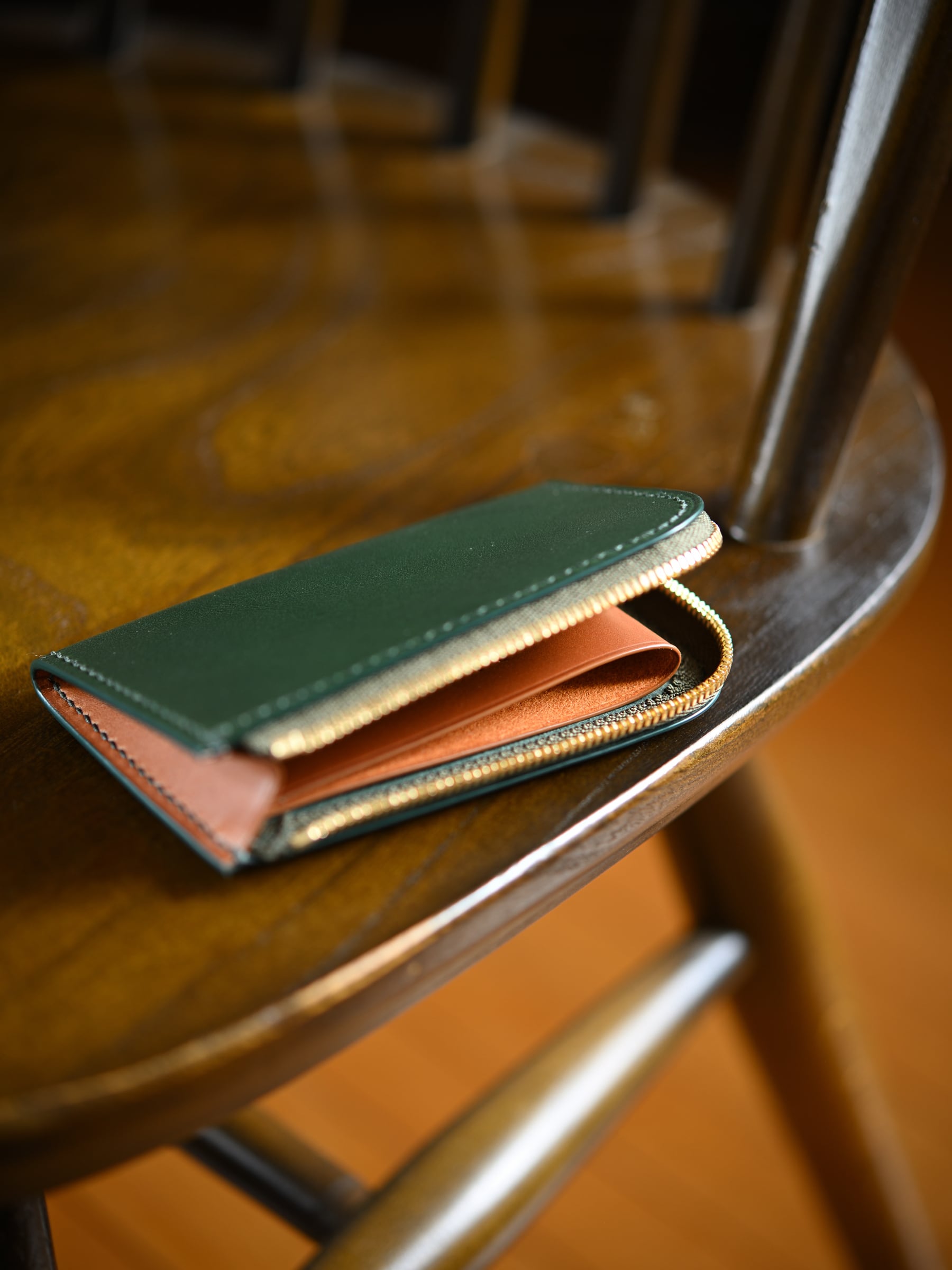コンパクトさを活かすために、あえてカードポケットなどの細かなパーツを排し、コインポケットを片側に寄せたアシンメトリー構造を採用したオリジナルデザインです。